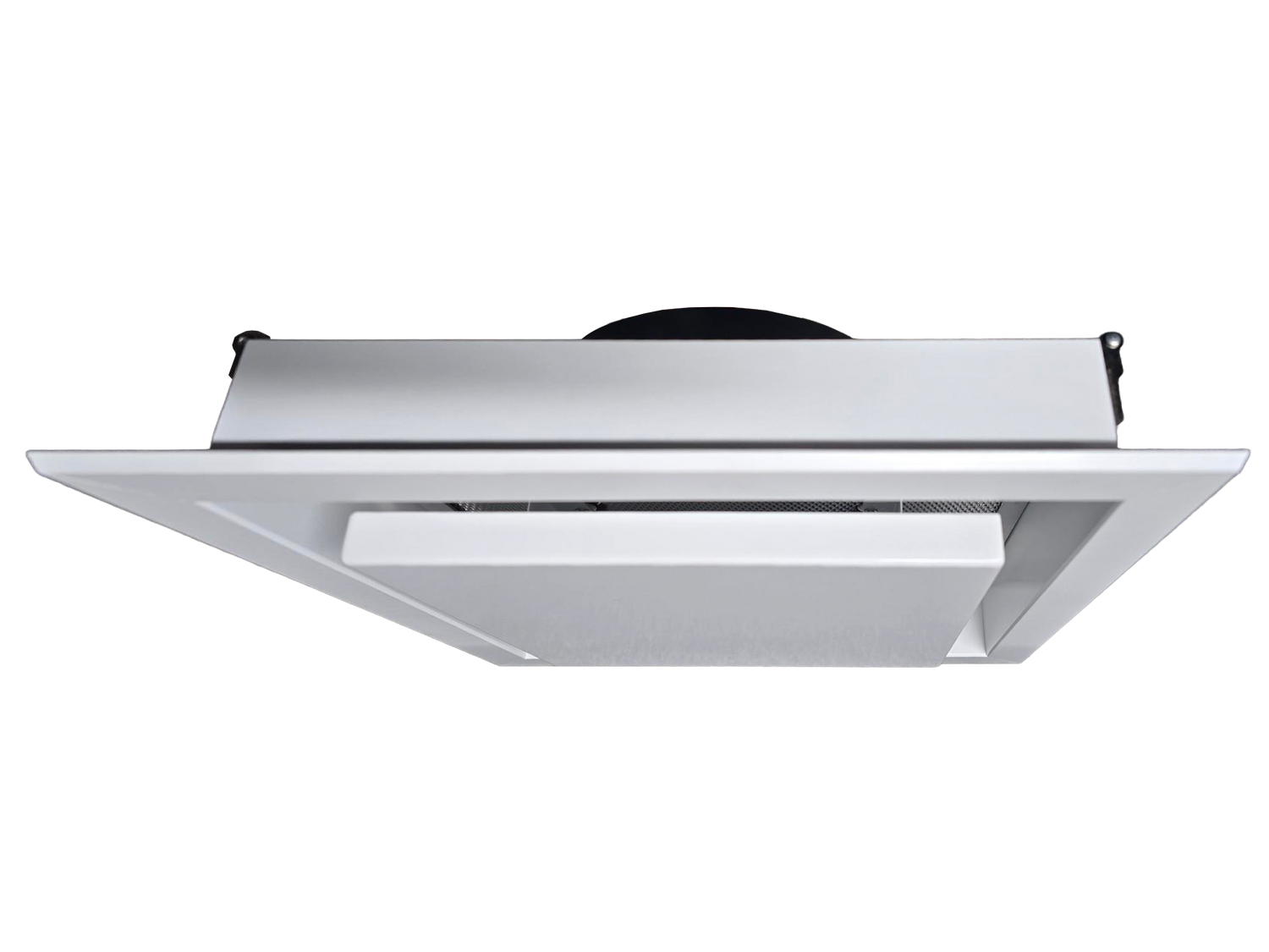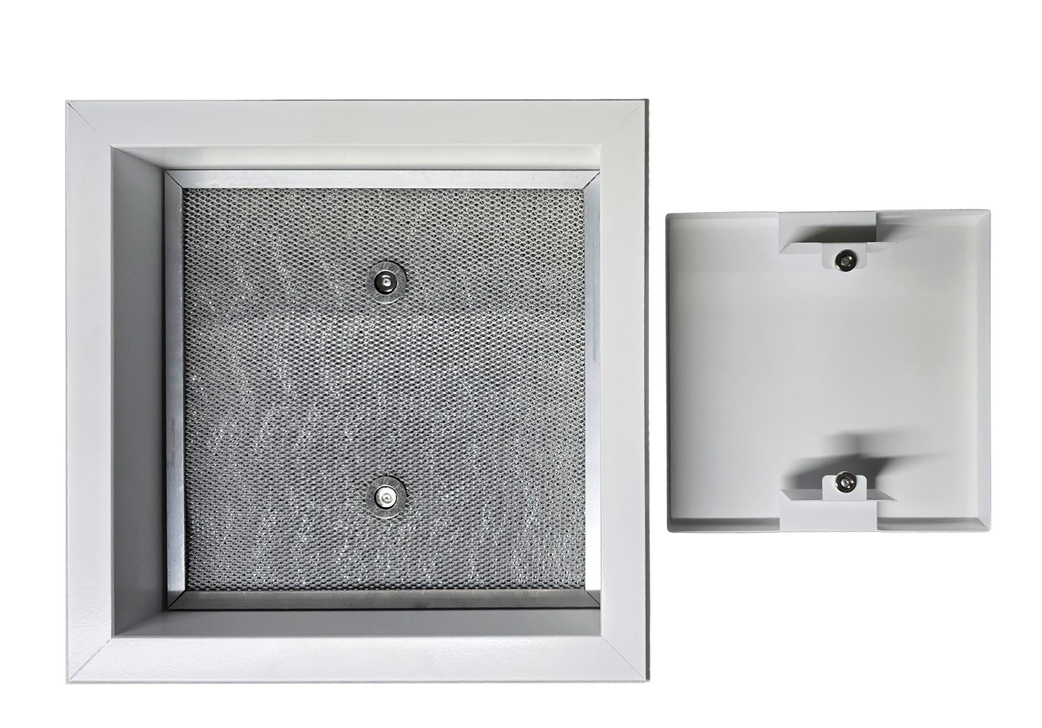 A one-piece, easy-fit extract grille with integrated grease filter—perfect for retrofit applications in small kitchenettes. Designed for installation in plasterboard ceilings or walls, it provides a clean, low-profile finish.